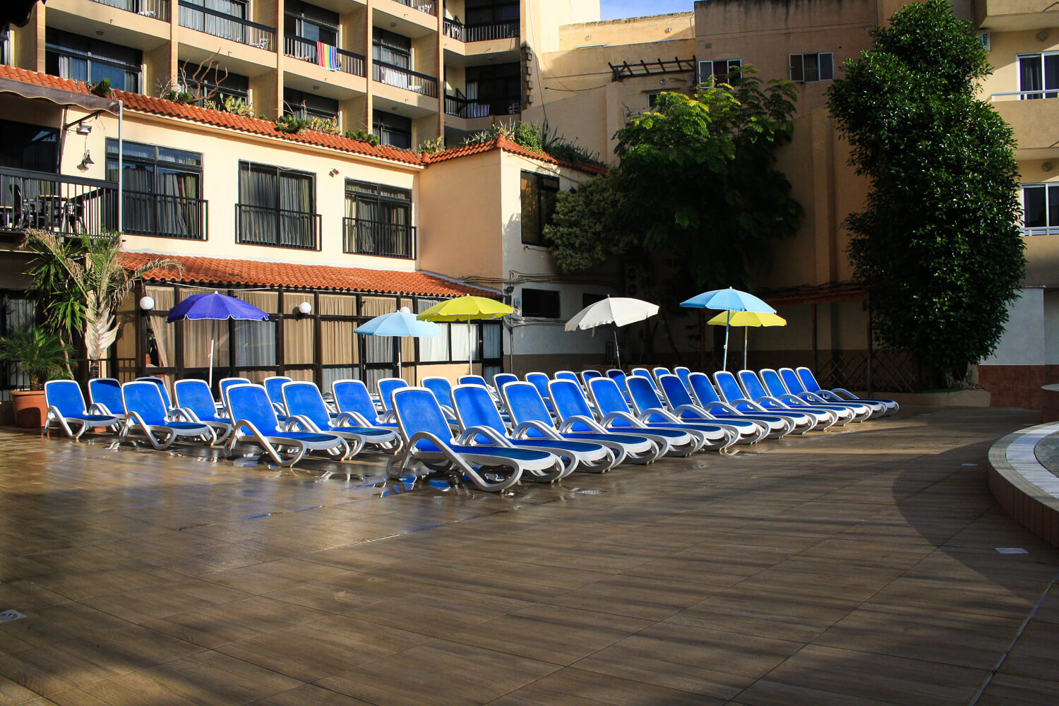 The hotel features a large outdoor pool area, including adult and children’s pools, surrounded by a sun terrace. Guests can relax on sun loungers and enjoy refreshments served poolside during the day. It’s an ideal spot for both families and those looking to unwind in the sun.