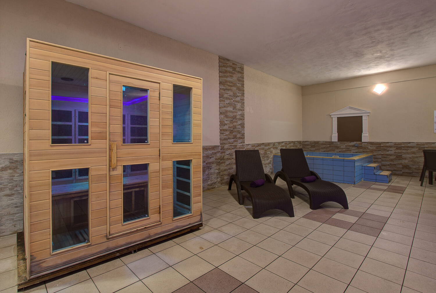 The indoor pool is available year-round, with a heated option during cooler months. A Jacuzzi and sauna are also available nearby, providing a relaxing retreat regardless of the season.